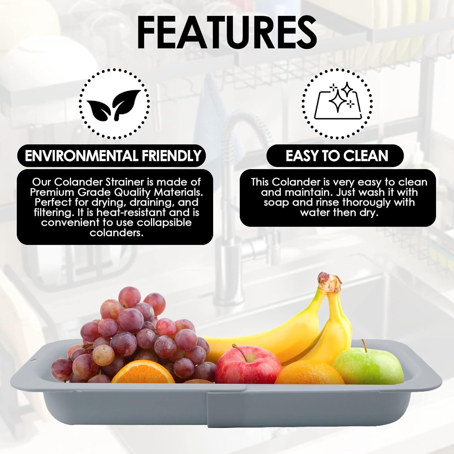COLLAPSIBLE COLANDER STRAINERS The strainer's convenient and ergonomic design will make cooking easier than ever . It can meet different needs, adapt to different sink sizes, freely adjust the length, can be a large capacity storage.