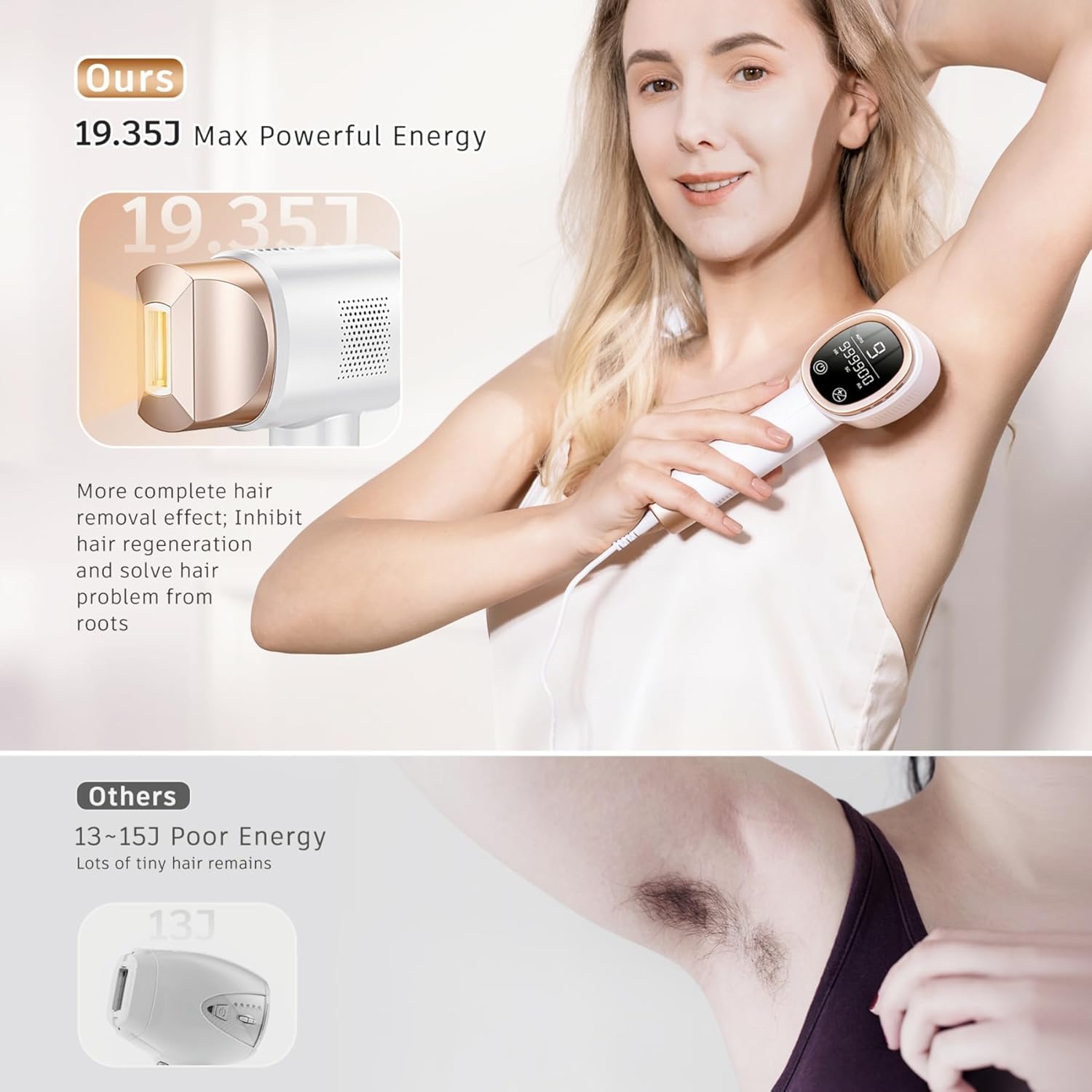 Powerful Energy Max 19.35J: With customizable 9 intensity levels, the hair remover for women can be used on various body areas. Featuring a maximum energy output of 19.35J, Blissky IPL hair remover effectively targets hair follicles at the root, delivering smooth, hair-free skin in just 8-12 weeks.