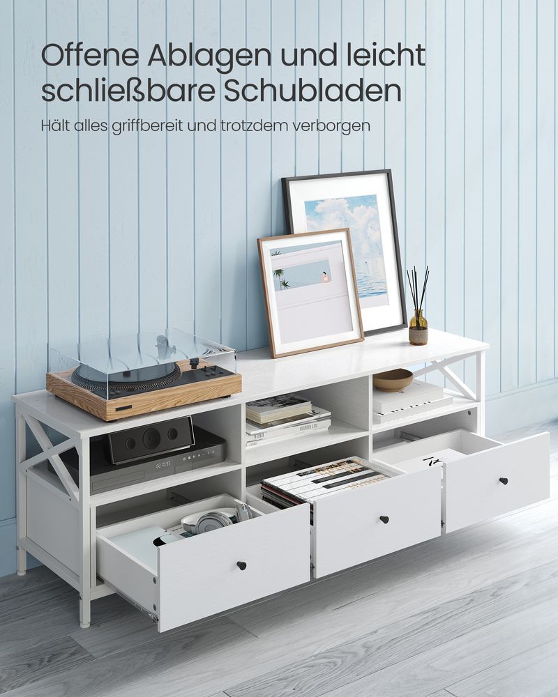 [What You Get] TV cabinet with 3 open compartments, 3 drawers, 1 spacious surface and 4 adjustable feet that even out unevenness on the floor.