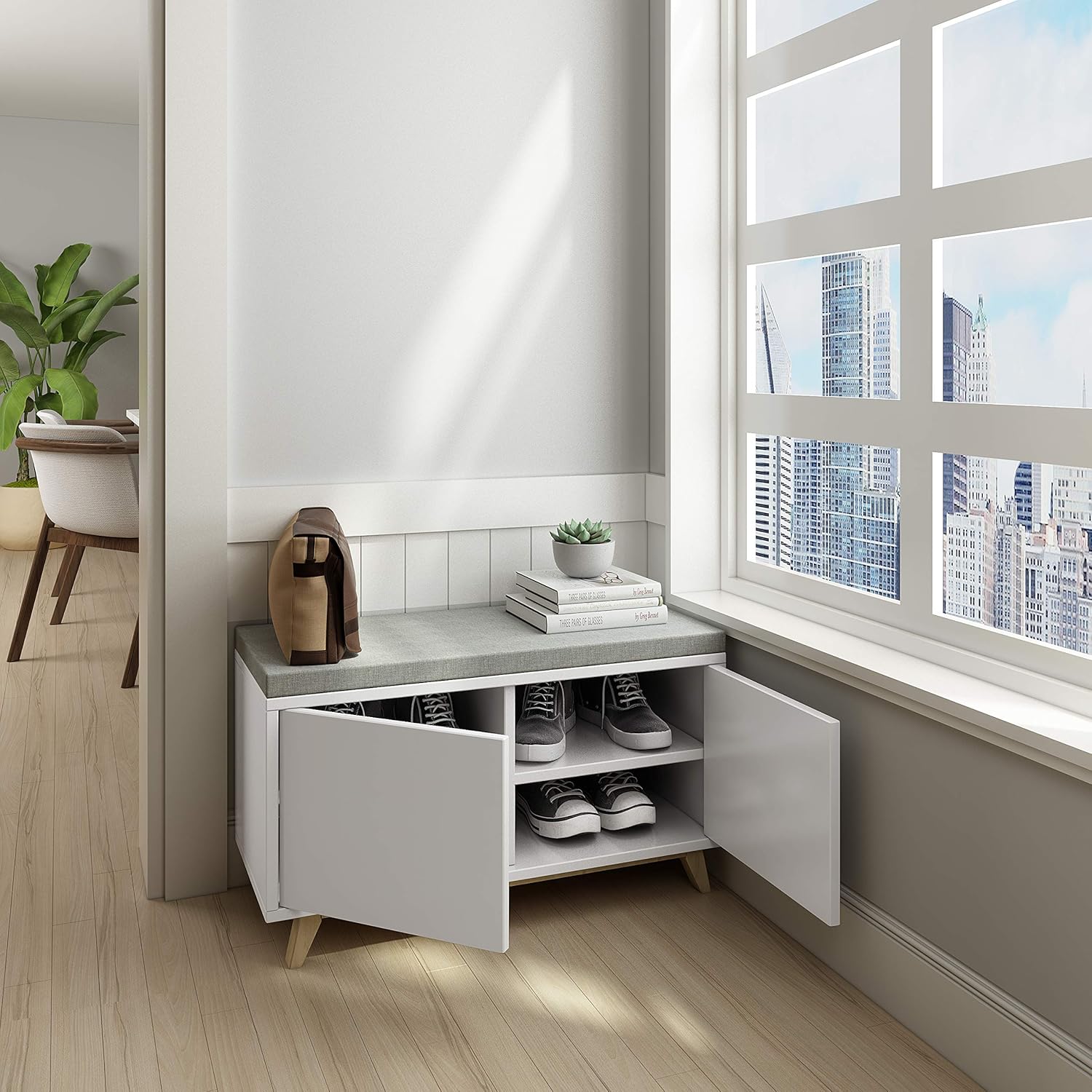 This elegant wooden shoe bench combines functionality with refined aesthetics. The integrated cushioned seat provides comfortable seating while you change shoes, making it an essential entryway piece. Its streamlined white finish complements any interior design scheme seamlessly. Engineered for compact spaces, the 38 cm width fits perfectly in narrow hallways without compromising storage capacity. The adjustable compartments on both sides accommodate diverse footwear—from athletic shoes to stilettos and tall boots—allowing you to customize the configuration to your specific needs. Dimensions: L 84 x W 38 x H 49 cm. A sophisticated storage solution that marries practicality with contemporary design.