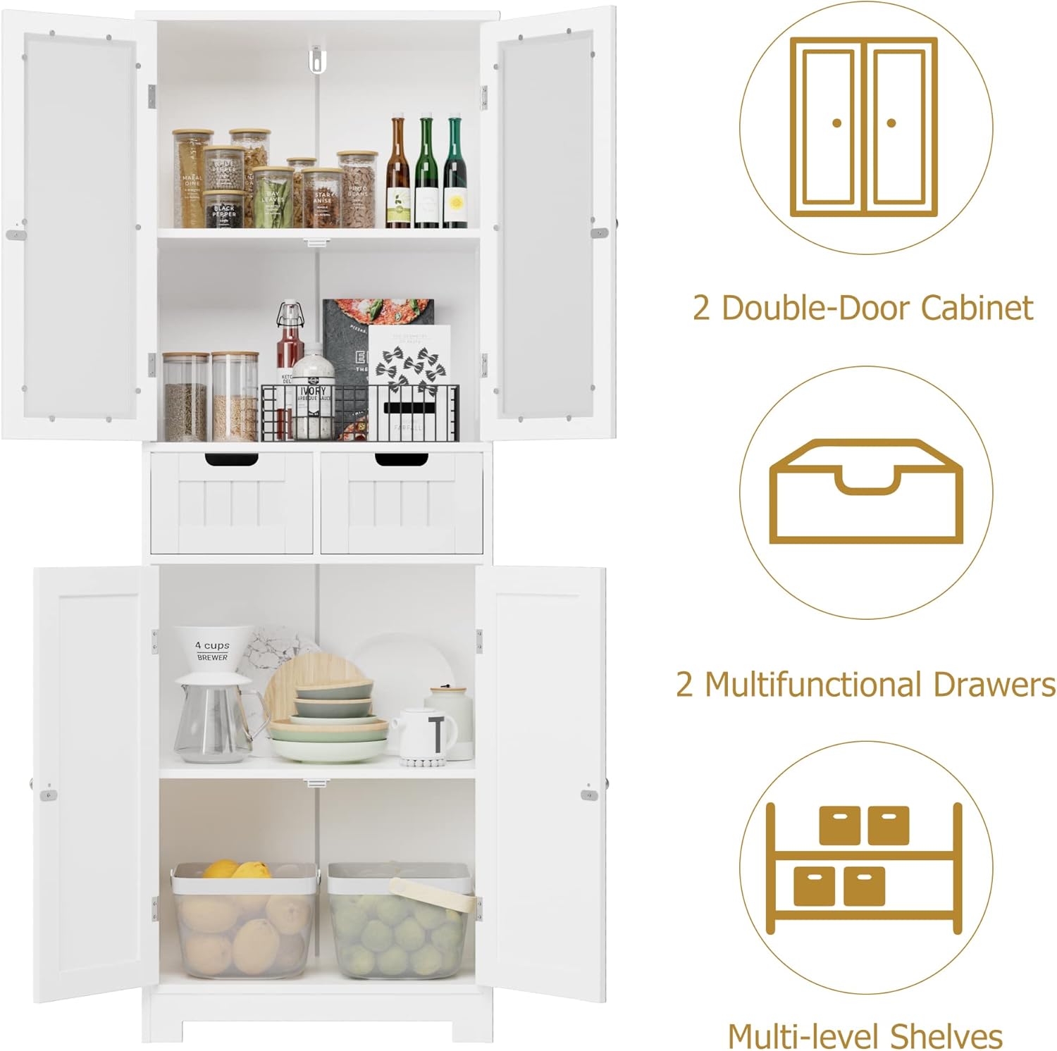 THOUGHTFUL DESIGN:The multifunctional cabinet has a milk glass door that ensures cleanliness and shows you what you are looking for at a glance. The silver handles complement the white cabinet and show the elegant style of the cabinet. The included tilt protection ensures stability and safety.