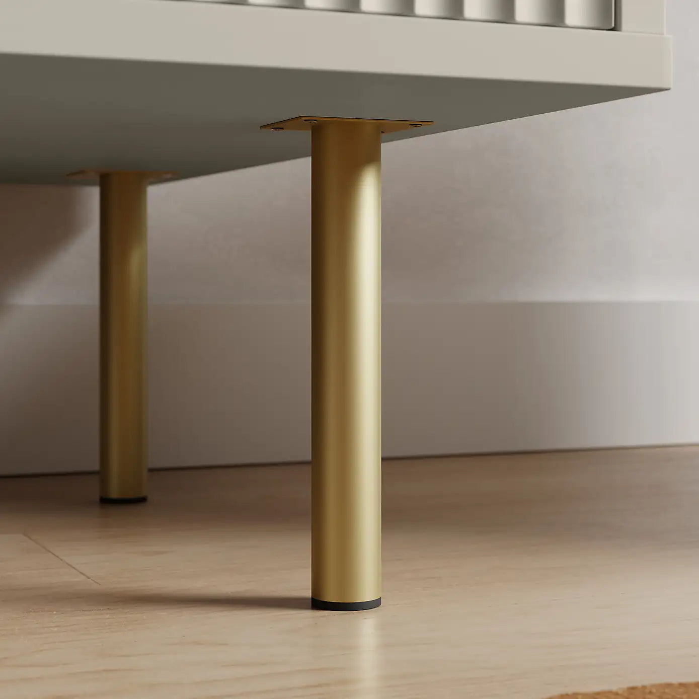 Subtle matte gold finish handles and legs