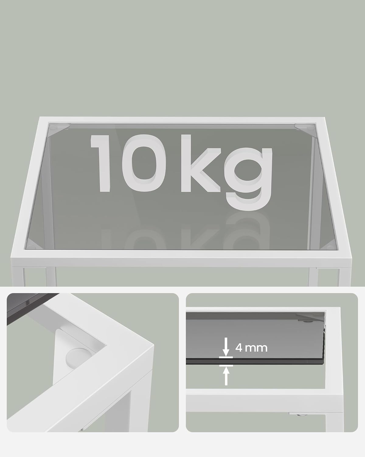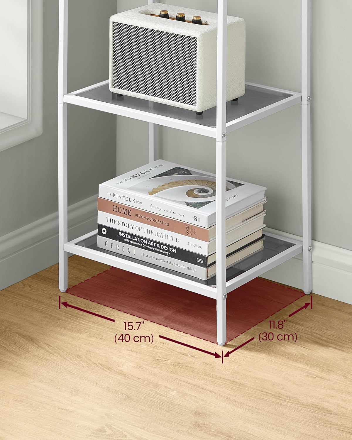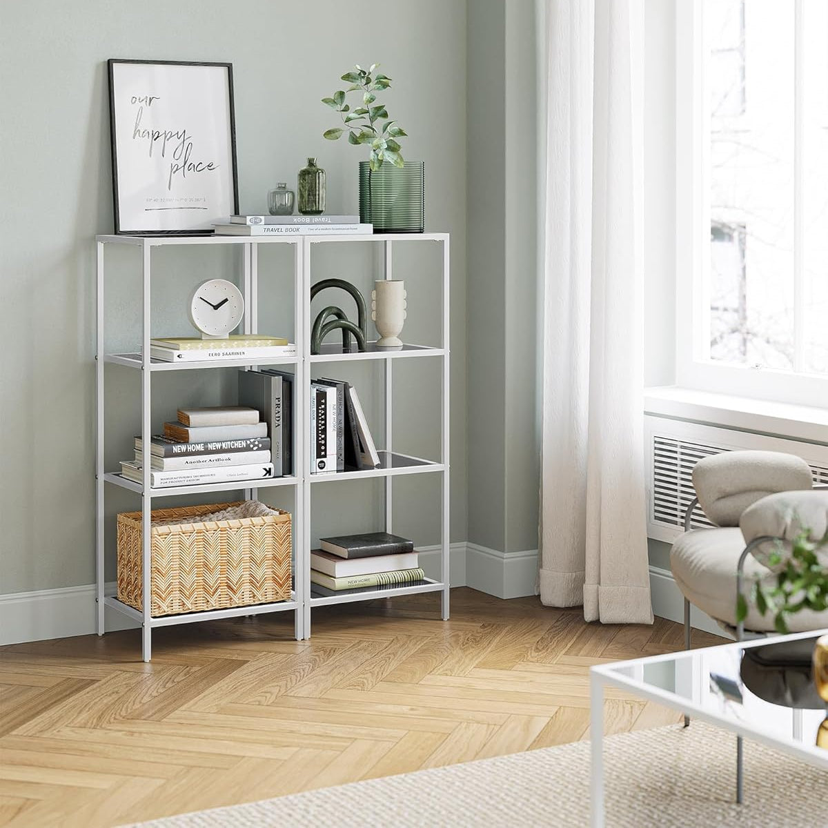 [Show your decoration] With slate gray glass and a minimalist pearl white frame, this 4 shelf has a simple design that allows you to better display your plants, books and collections