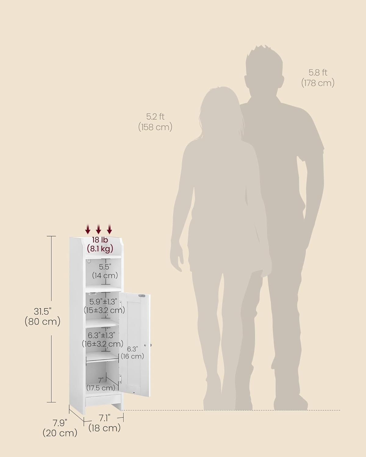 [Perfect for Narrow Spaces] Boasting a space-saving figure, sleek lines, and a white color, this 7.9"D x 7.1"W x 31.5"H bathroom cabinet fits perfectly in narrow spaces and elevates the aesthetic