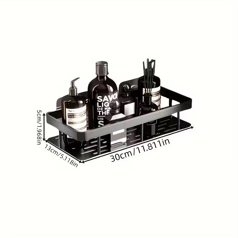 Elevate your bathroom organization with this sleek and sophisticated wall-mounted shelf, designed to combine contemporary aesthetics with superior functionality. Crafted from high-quality durable metal with a refined matte black finish, this storage unit adds a touch of industrial elegance to any shower or vanity area while resisting rust and corrosion in humid environments. The intelligent design features a fully ventilated base with precision-cut drainage slots, ensuring that water flows away instantly to prevent pooling and maintain a dry, hygienic surface for your toiletries. Engineered for security, the shelf is equipped with a raised guardrail that effectively prevents expensive bottles, jars, and diffusers from tipping over or falling. Utilizing a strong, drill-free adhesive backing, this organizer offers a robust load-bearing capacity without the need to damage your walls, making it the perfect hassle-free solution for decluttering your space.