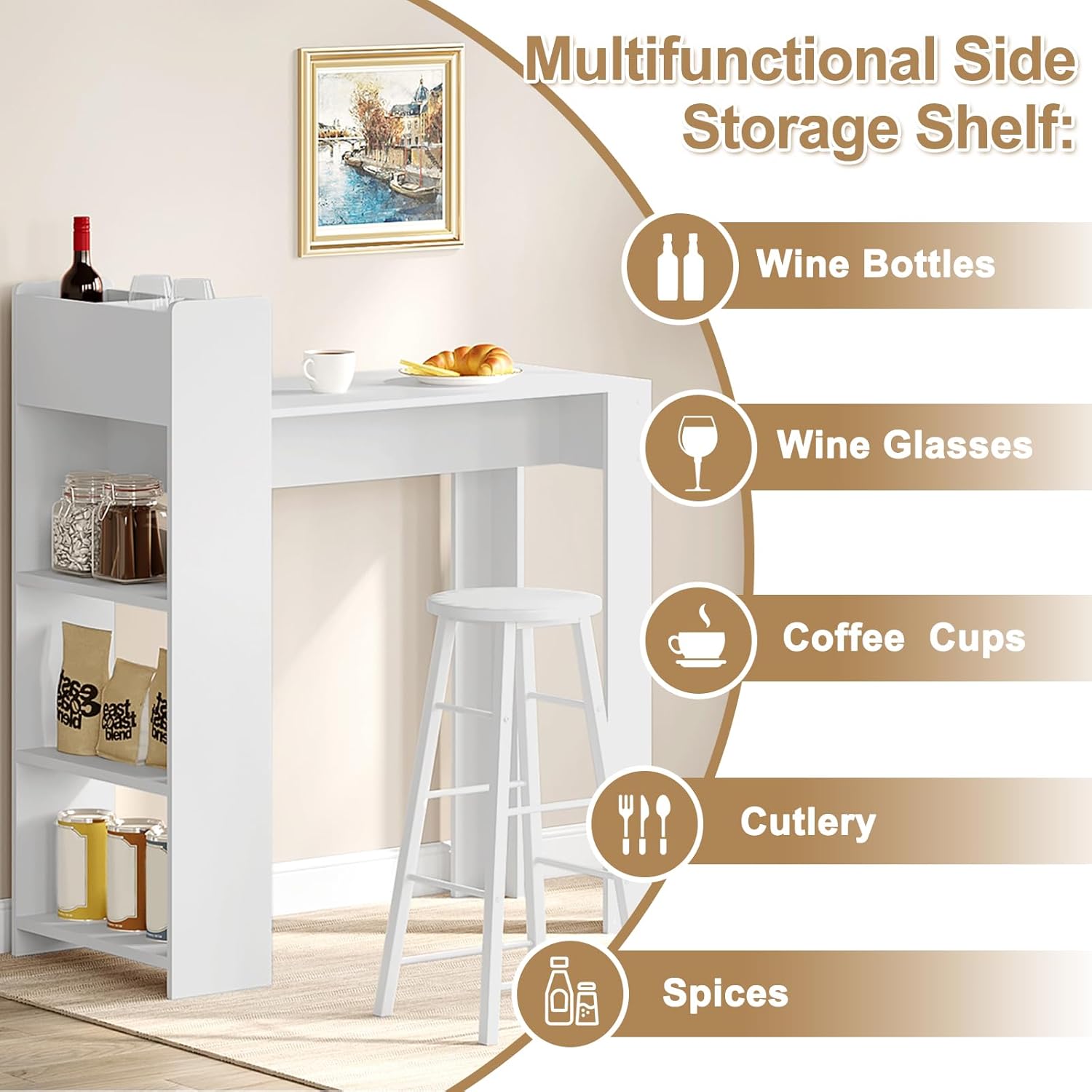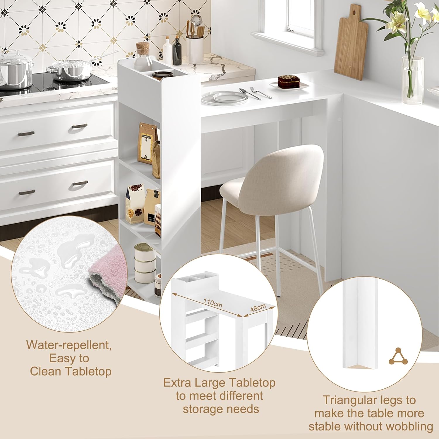 Bar Table with Storage Shelves: The breakfast bar table is designed with 2 open compartments and 3 side shelves with back panels. Allows you to store bottles, cutlery, spices or kitchen utensils with easy access