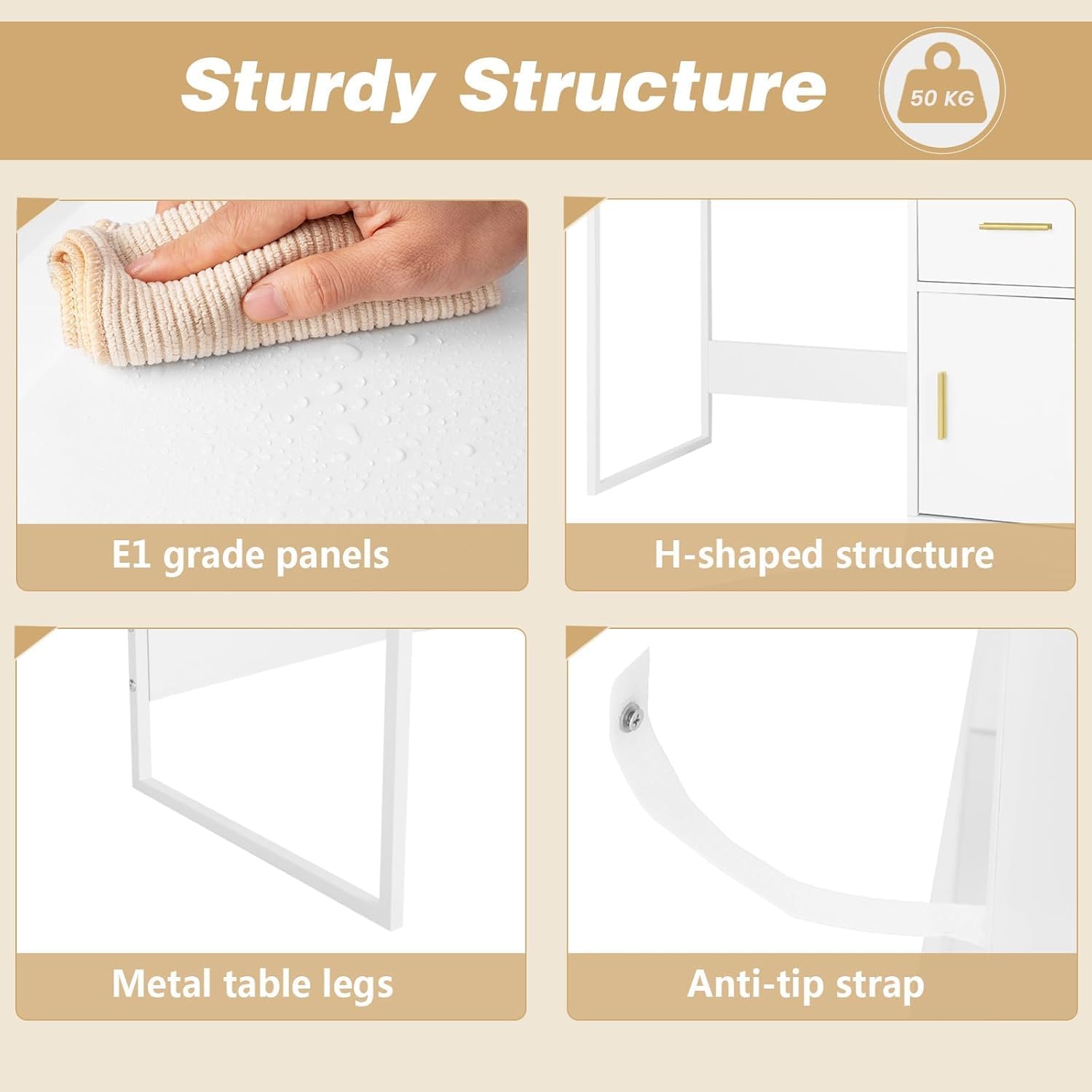 STABLE AND STURDY: Constructed from high quality particleboard, metal legs and reinforced bottom beam, the bedroom dressing table with lights is stable, sturdy and easy to clean, so that you can enjoy long-lasting use. Load capacity: 50kg